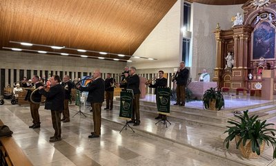 Warmes Licht drang aus der katholischen St. Afra Kirche in Neckargerach am Sonntagabend des 26. Oktober 2025. Das traditionelle Hirschgeweih im…